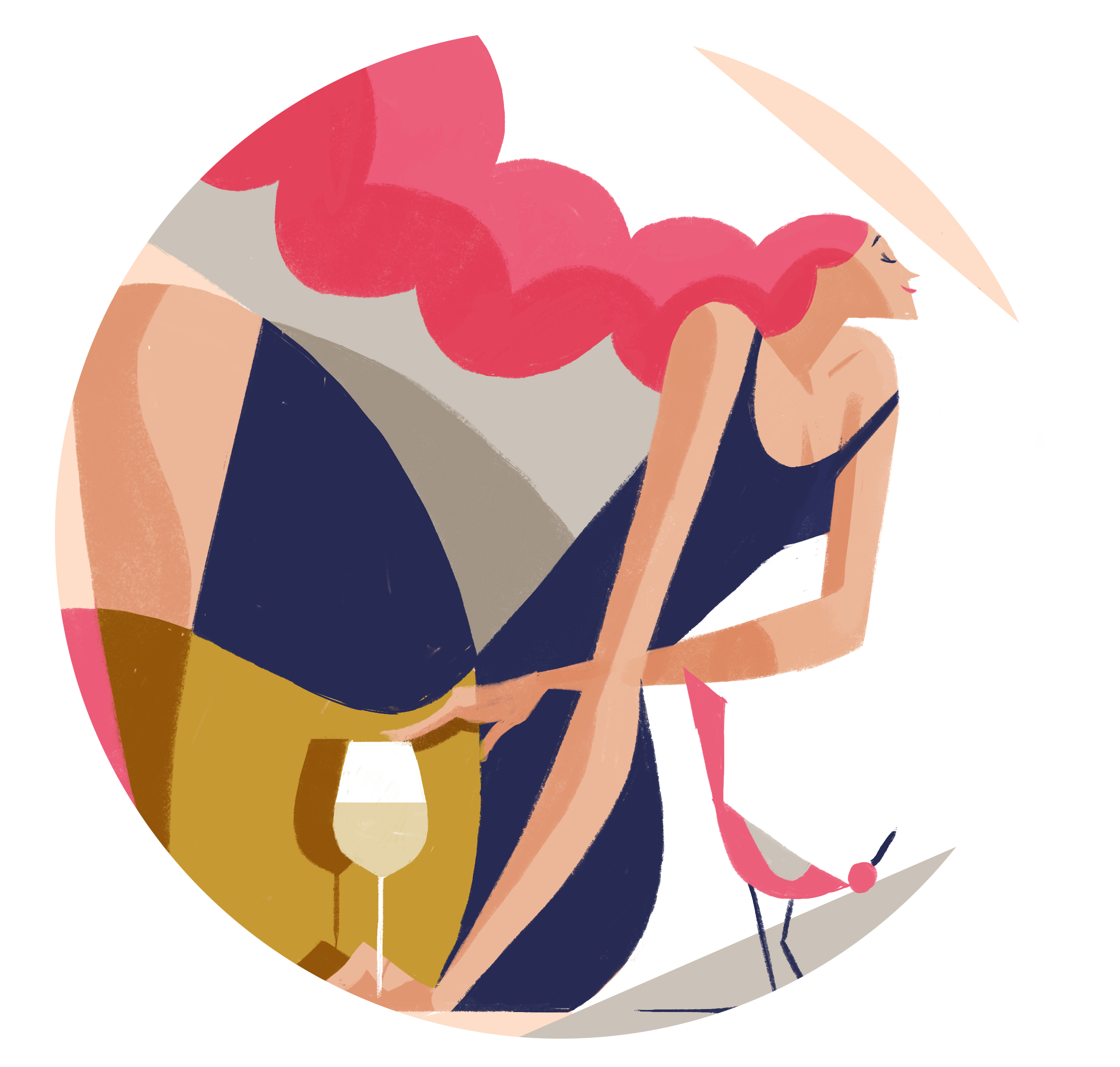 Comincia tutto con un dialogo, uno scambio intimo e profondo, ma allo stesso tempo leggero e spensierato di racconti e confessioni. Un intreccio di linee, traiettorie e geometrie che corrono sul bianco del foglio e si inseguono, come le parole tra i discorsi di due amiche che non si vedono da tempo. Si mescolano i ricordi e i tratti creano forme che si colorano con tinte a volte delicate e a volte decise. I rosa e i grigi, più intimi, esplodono nella spensieratezza e nella risata di un fucsia e di un blu. Le due donne si fanno leggere, tra una risata, un sorso di vino e una confessione sottovoce, diventano uva e nuvole, accarezzano i calici e si perdono in ricordi sempre più allegri. Un uccellino si poggia tra loro come un respiro prima di una risata, come una firma alla fine di un quadro: La Pettegola.