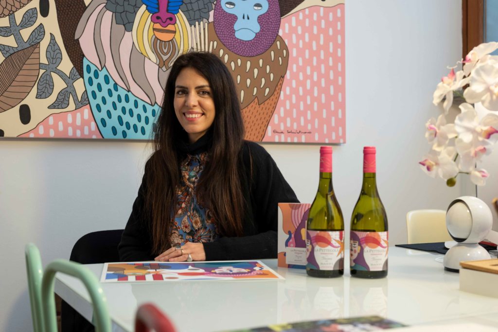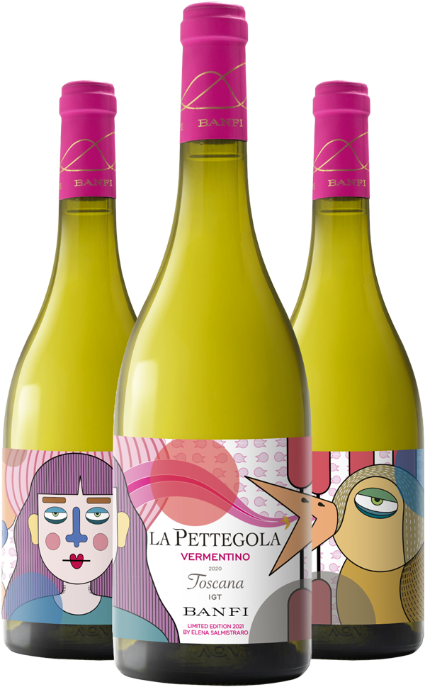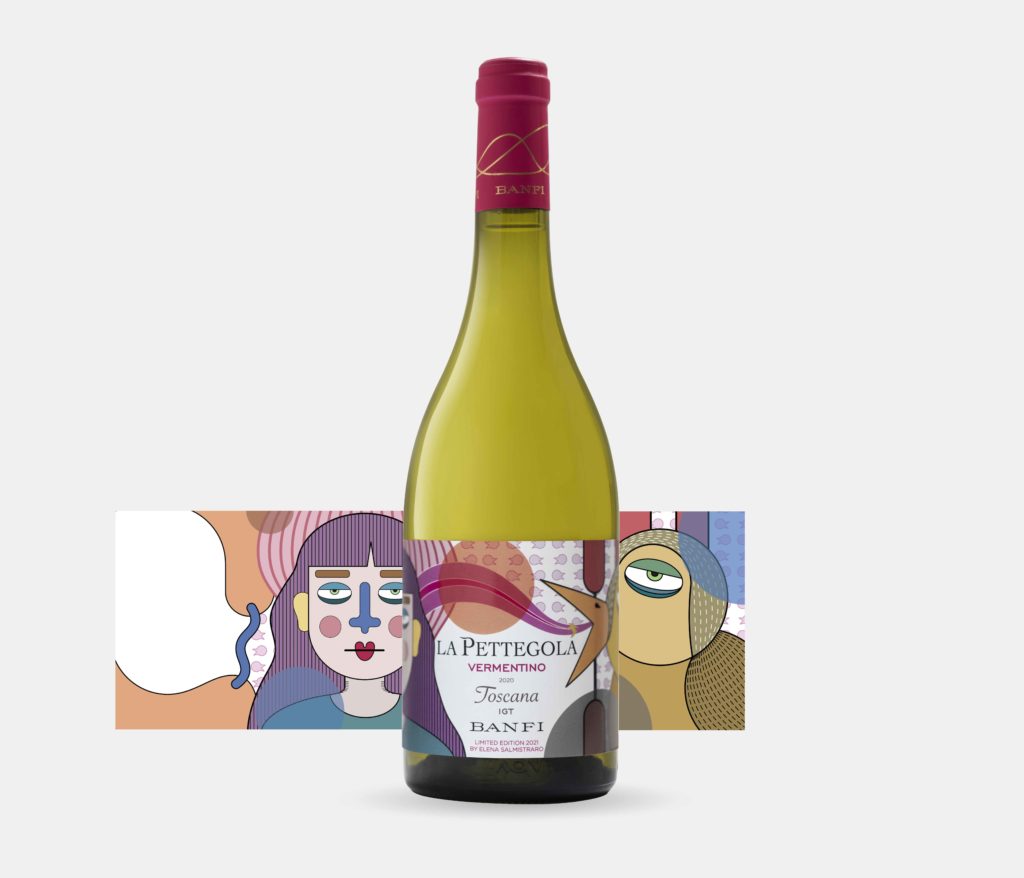 La “Pettegola” per Banfi è il nome spiritoso e divertente di un uccellino, tipico della costa toscana, che ho immaginato essere furbo e canterino. Per questo mi sono divertita a raffigurare una ragazza giovane e colorata ma dall’aspetto riflessivo, completamente immersa nell’ascoltare il canto allegro e festoso della pettegola. I colori vivaci e le forme rigide, tutti elementi tipici del mio linguaggio artistico, esaltano l’atmosfera gioviale e di convivialità che caratterizza il gioioso momento del brindisi, reso ancor più spensierato grazie al cinguettio del vivace uccellino. Il canto della pettegola diventa così la colonna sonora perfetta per trascorrere un’allegra serata in compagnia mentre si gusta un calice del vino che porta il suo nome.