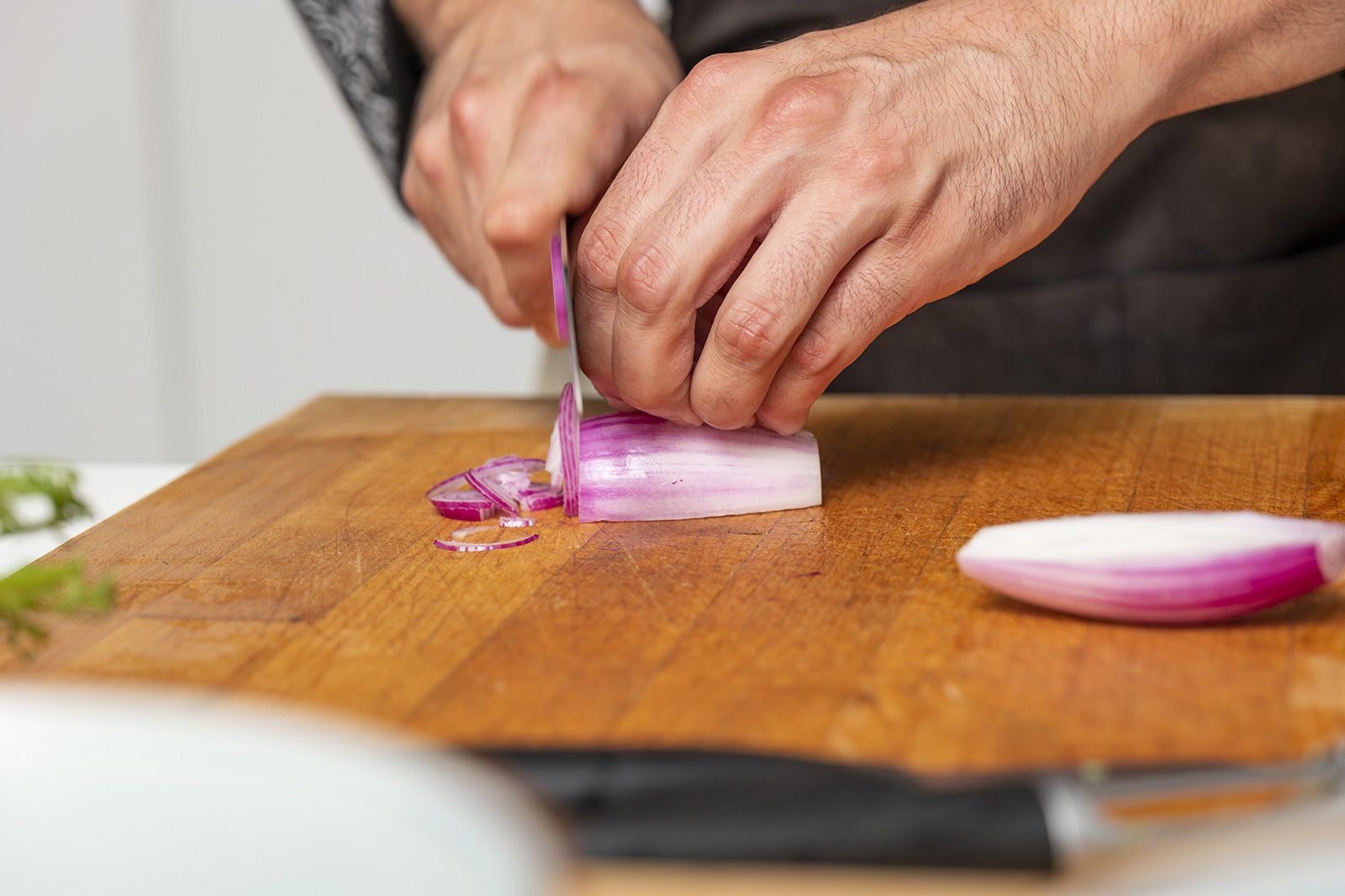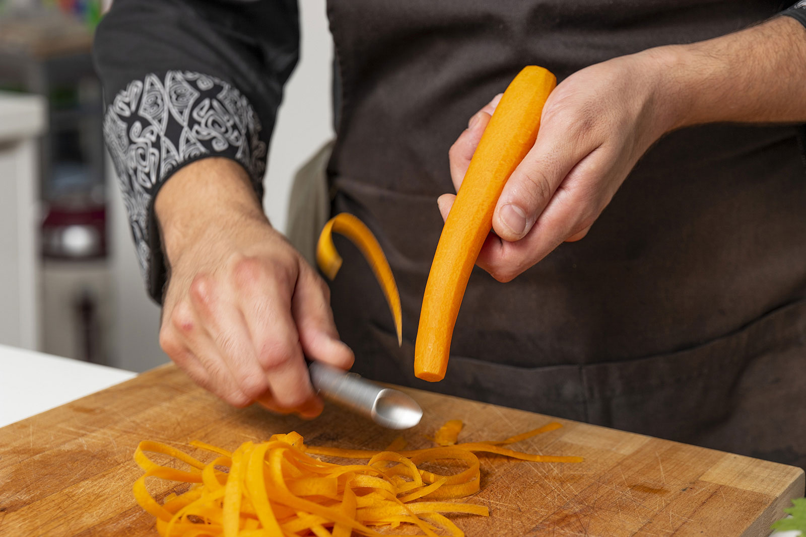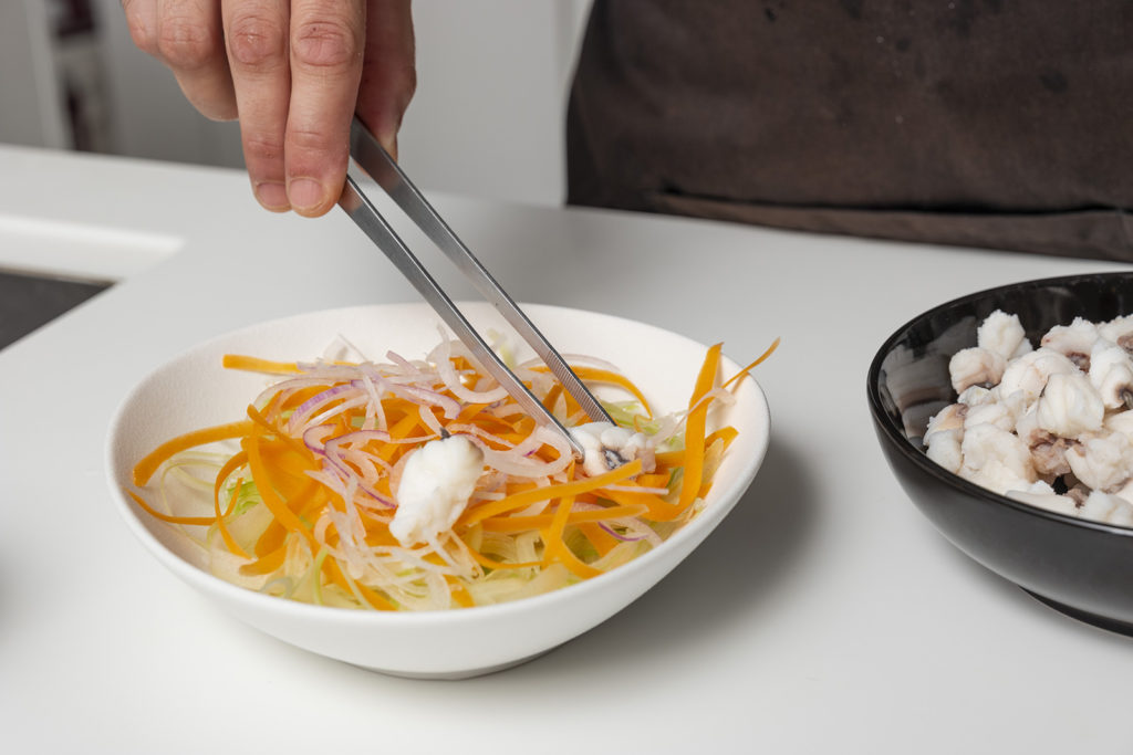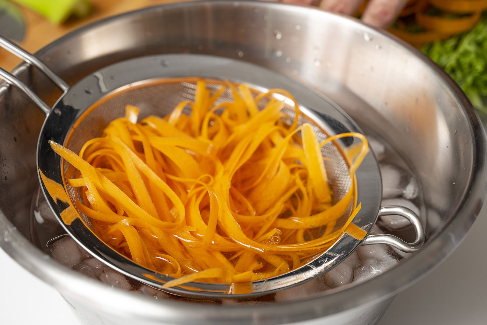 Ora pela una carota e ricava delle striscioline finissime. Monda e pulisci il sedano, elimina i filamenti e ricavane, anche qui, striscioline finissime, come se fossero spaghetti. Taglia finissima pure la cipolla. Metti tutta la verdura in acqua ghiacciata per 10 minuti, poi scolale e asciugale bene.