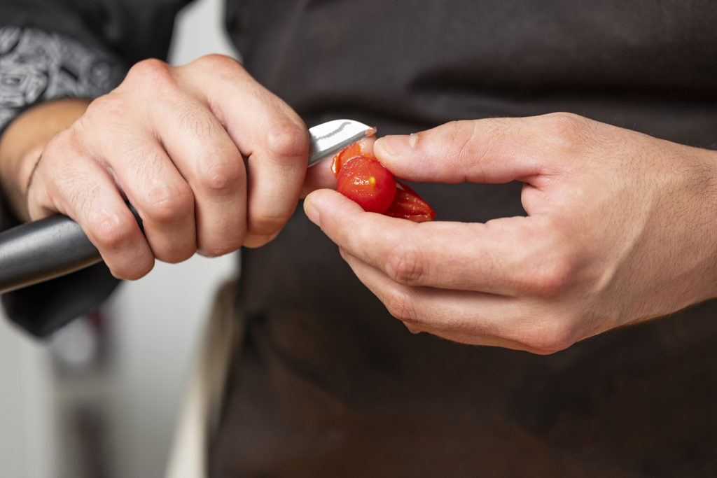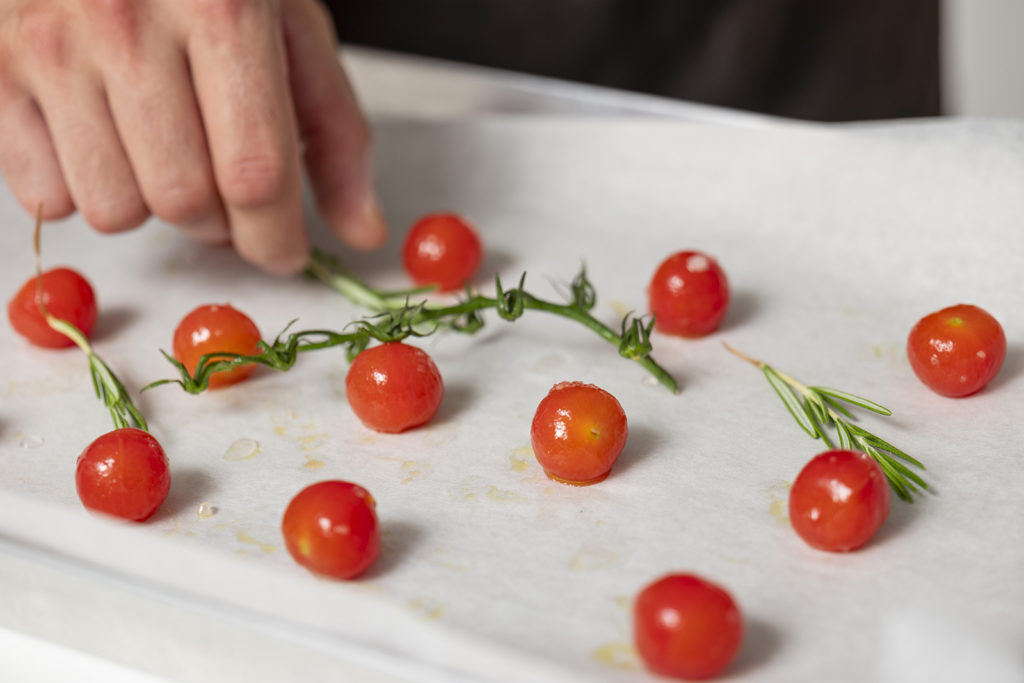 Il procedimento è il seguente. In primo luogo, incidi i pomodorini sul fondo e immergili in acqua bollente poco salata per 20 secondi, quindi scolali e mettili in acqua e ghiaccio, infine togli la buccia. Condisci con olio e zucchero e adagiali ordinatamente su una teglia con carta da forno. Cuoci a 140 °C per due ore e fai raffreddare.