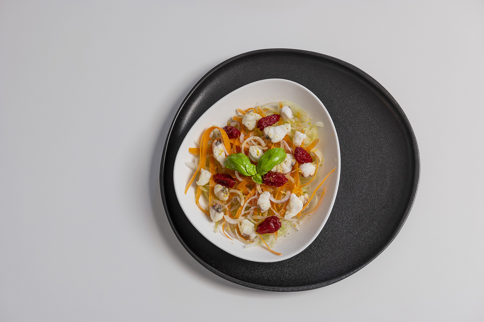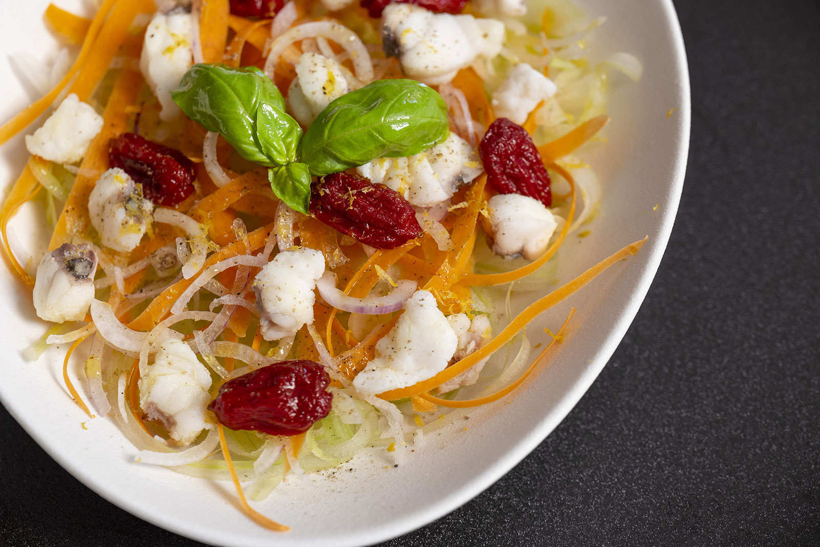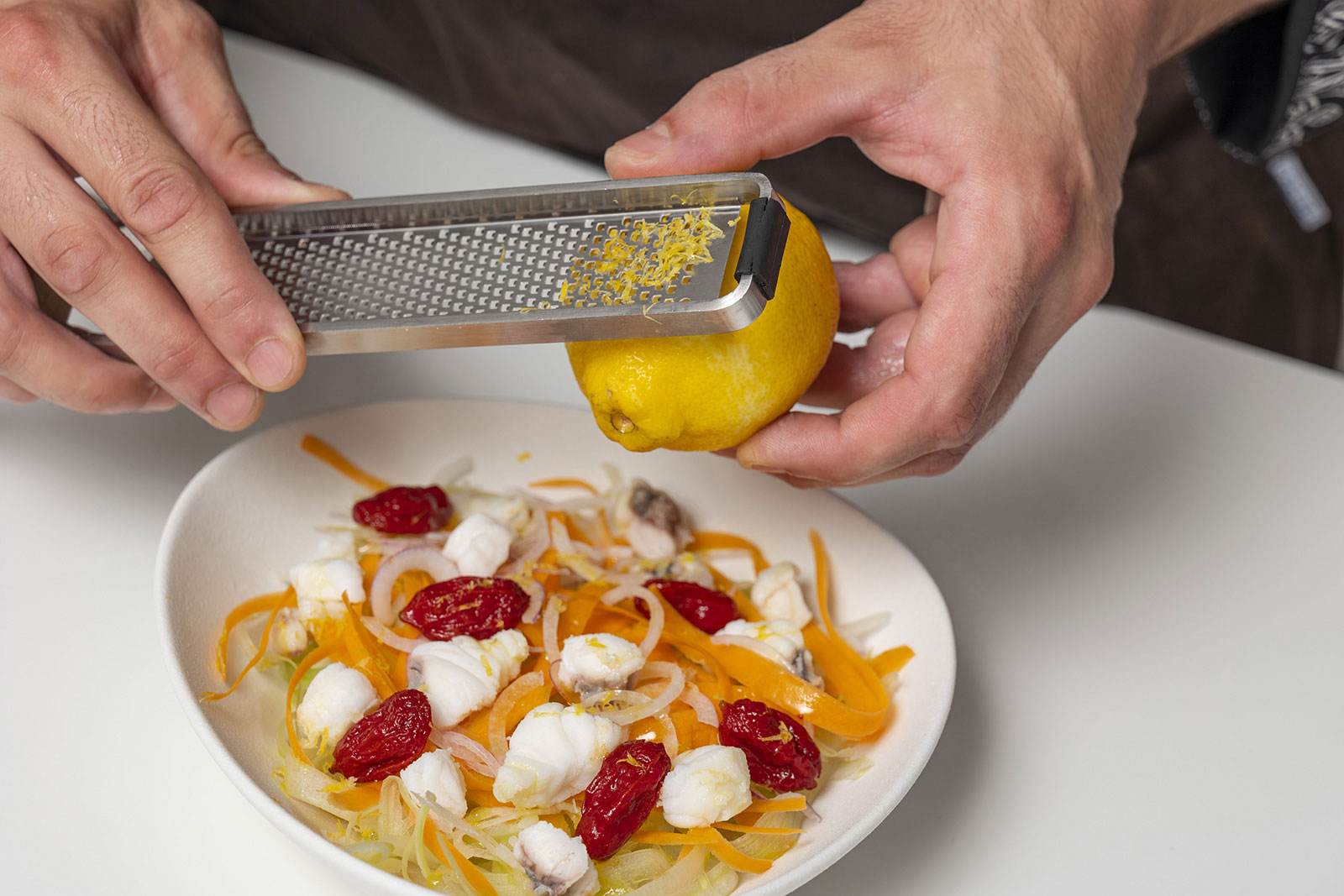 A questo punto elimina la spina centrale della rana pescatrice e taglia a cubetti il trancio. Scotta in acqua per 8-9 minuti, scola e fai raffreddore. Poi condisci tutta la verdura cruda con olio, sale e pepe e adagiala sul fondo del piatto, unendo la rana pescatrice e i pomodorini confit. Infine condisci con un filo d’olio e la scorza grattugiata di un limone. La tua Pescatrice alla Catalana è pronta a fare invidia a tutti i tuoi ospiti!